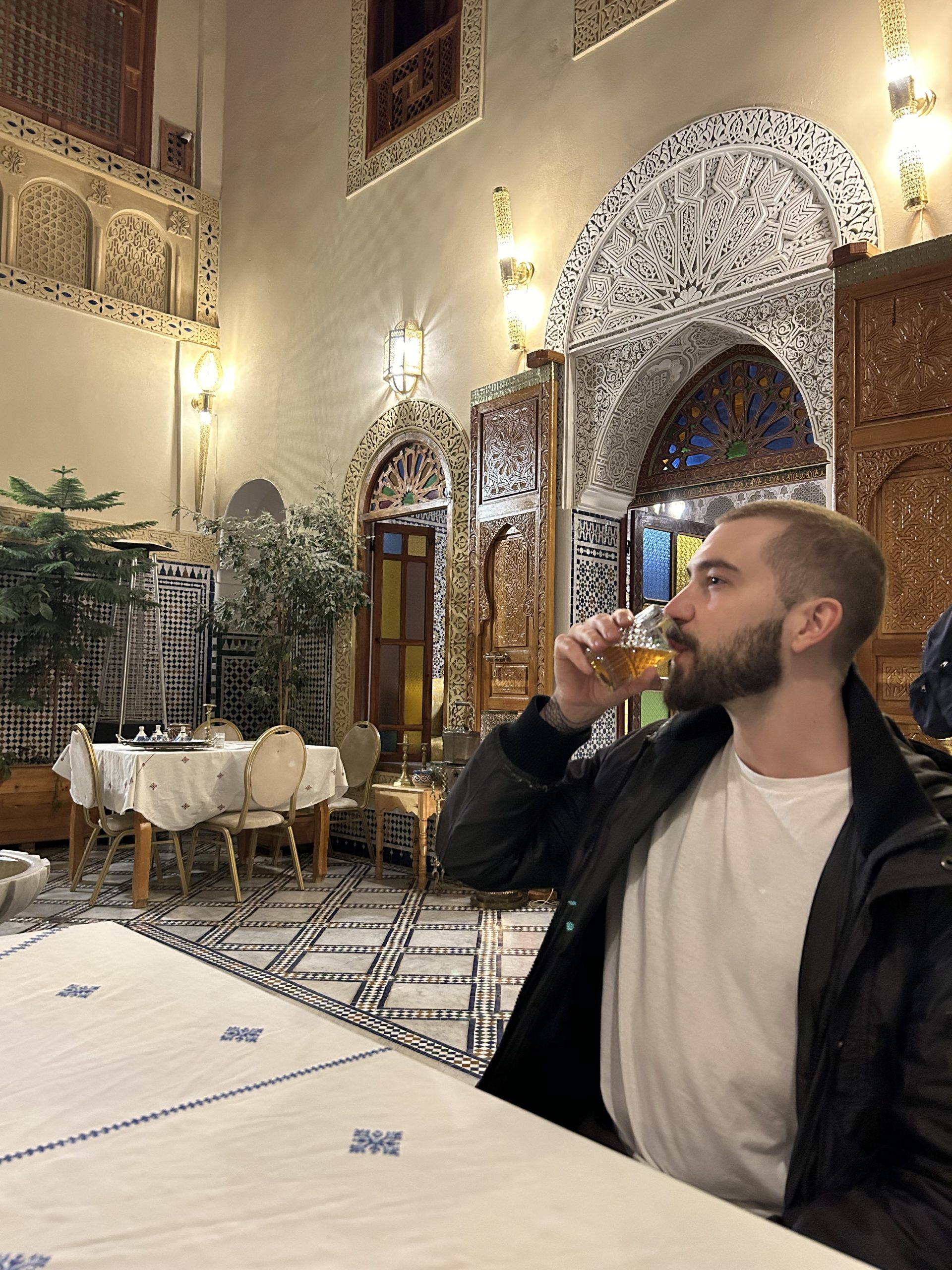 Wir bereiteten eine köstliche Gurkensuppe, einen Auberginen-Eintopf sowie drei Tajines zu: eine mit Hähnchenfleisch, eine mit Ziegenfleisch und eine mit Rindfleisch. Der Nachtisch bestand aus einem erfrischenden Obstsalat, der aus mehr als sechs verschiedenen Obstsorten zubereitet wurde. Die Zubereitung des sogenannten „marokkanischen Whiskeys“, ein Pfefferminztee mit grünem Tee und Zucker – eine Tradition in Marokko – durfte natürlich nicht fehlen.